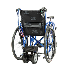 Propulsore elettronico per carrozzine standard che consente all’accompagnatore di avere un aiuto nella spinta della carrozzina, specialmente in caso di salite e pendenze ripide.
